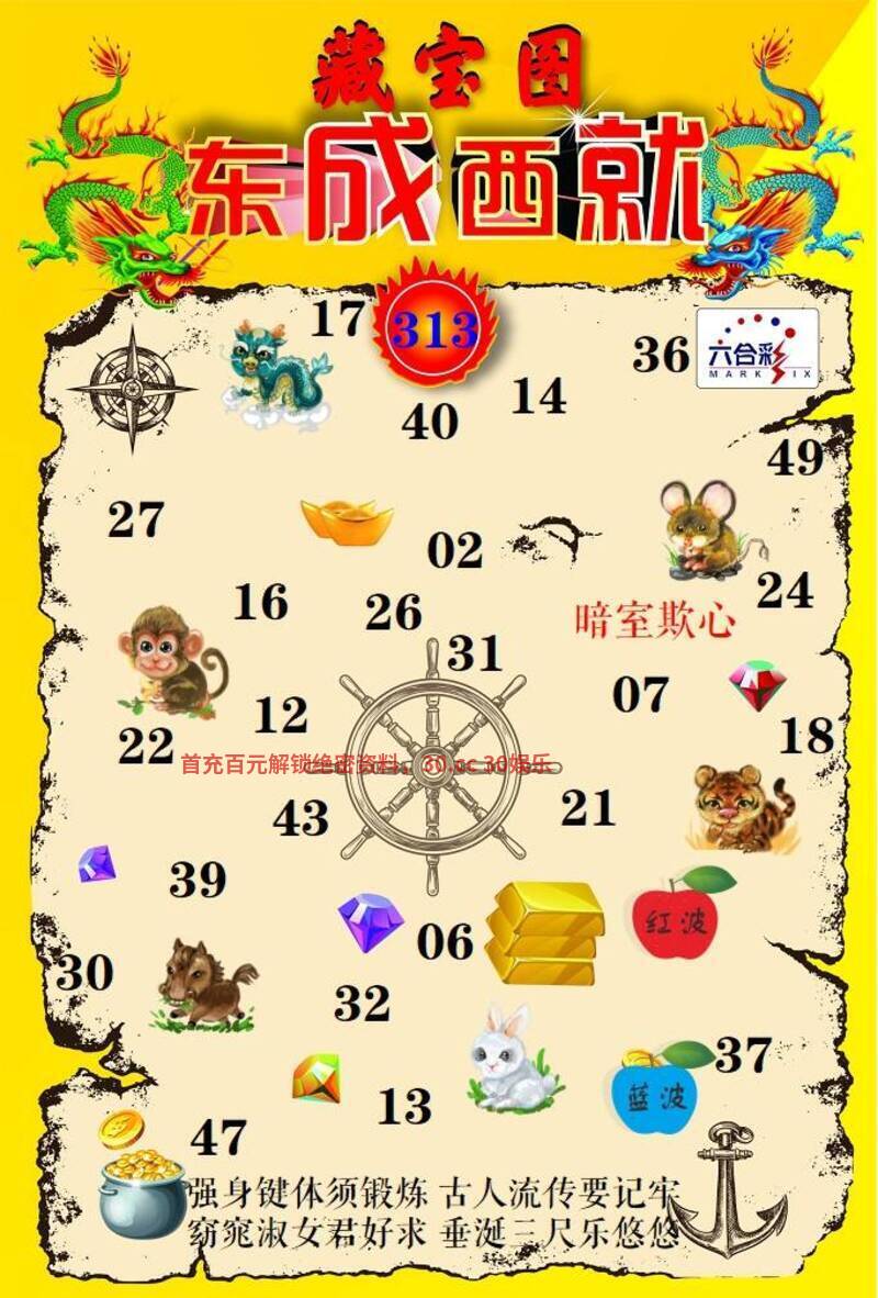 | 313期:解藏宝图【暗室欺心】 强身键休须锻炼古人流传要记牢,窈窕淑女君好求垂涎三尺乐悠悠。 综合六肖:龙鼠猴虎马兔 |