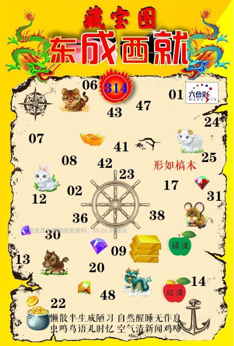 | 314期:解藏宝图【形娜槁木】 懒散半生成陋习自然醒睡无作息,虫鸣鸟语儿时忆空气清新闻鸡啼。 综合六肖:虎羊兔鼠马龙 图解双波:红波+绿波 |